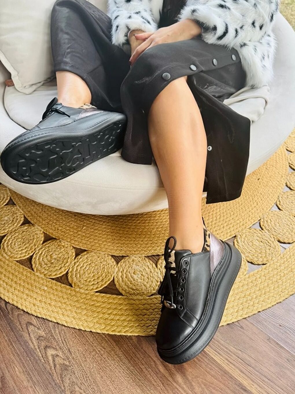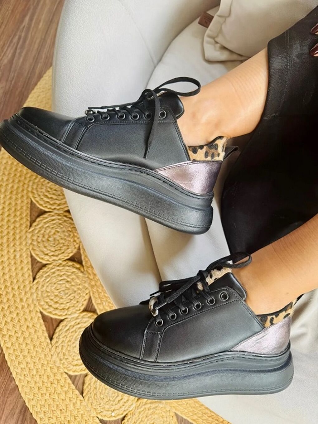 کفش کتانی و کفش ورزشی زنانه طرح پلنگی مشکی طلایی، کفی بلند، سایز ۶ سانتیمتر.