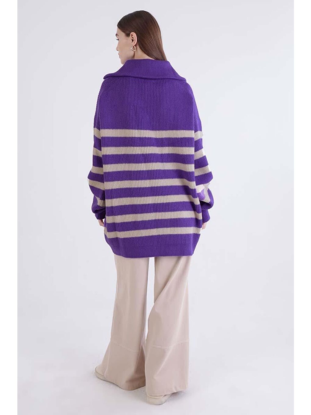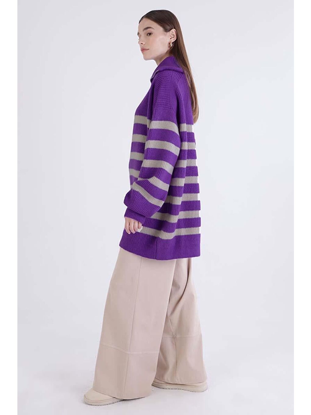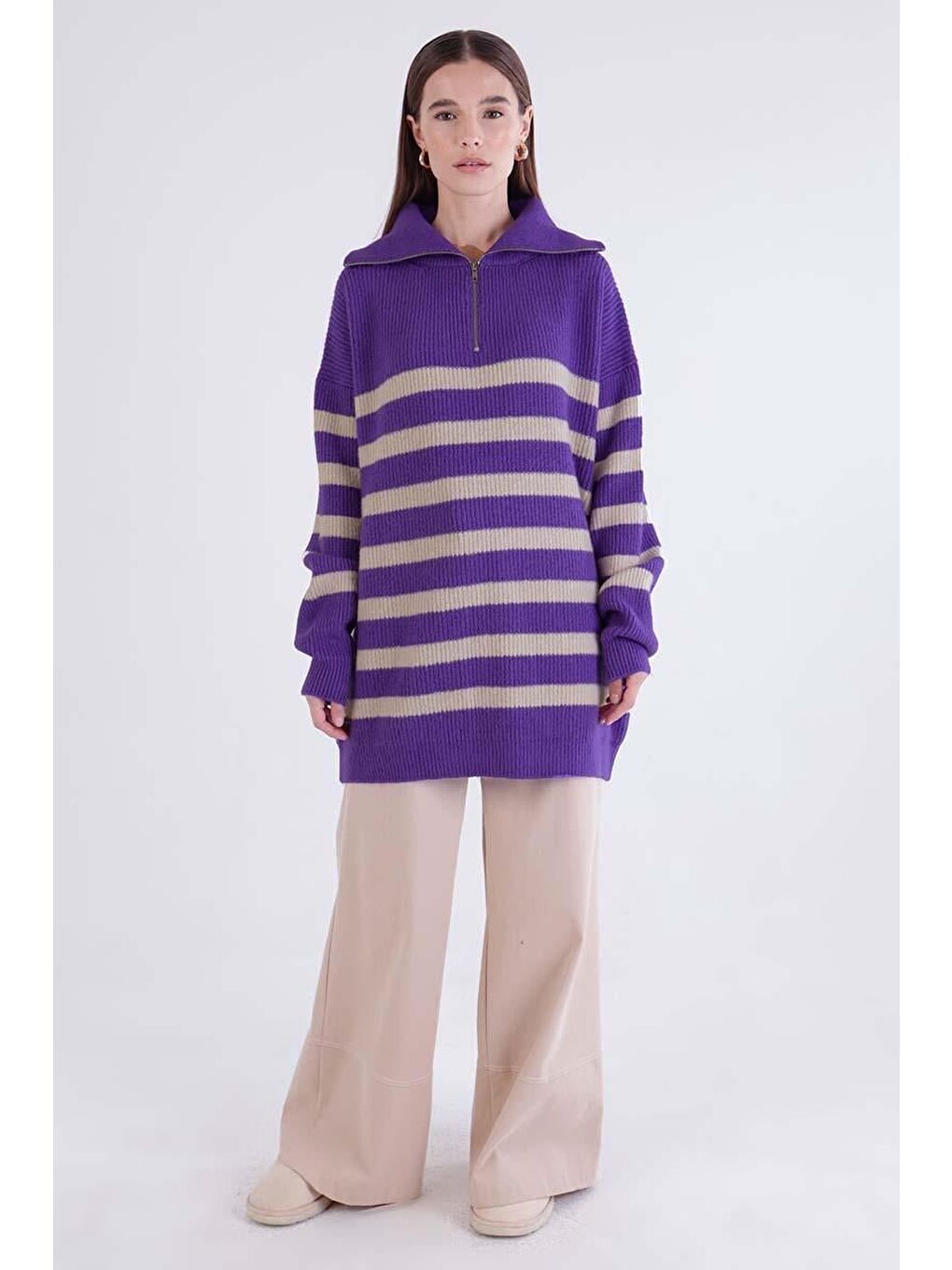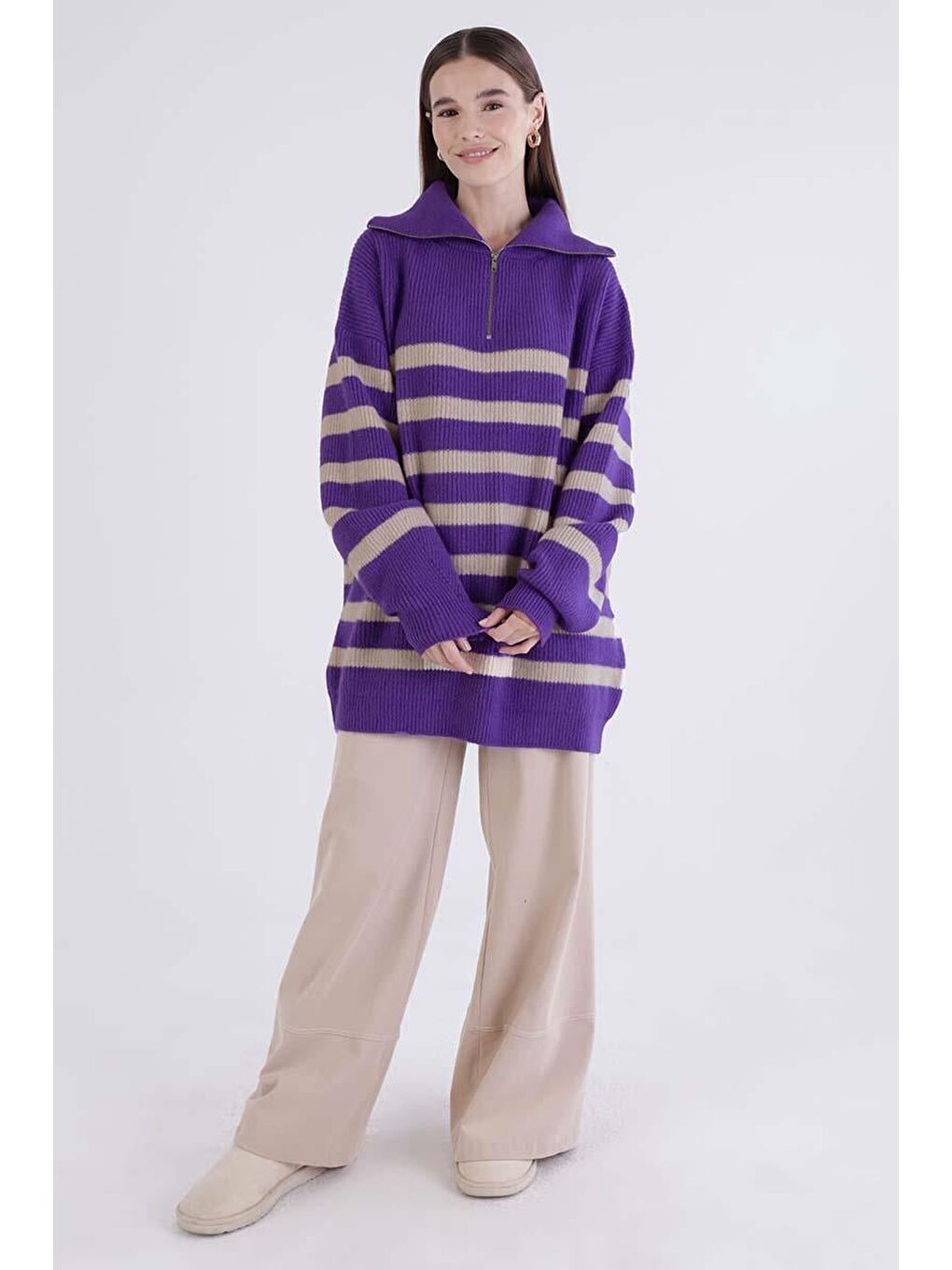 با ژاکت بافتنی زیپدار بنفش-سنگی یقه اسکی، استایلی مدرن و راحت داشته باشید