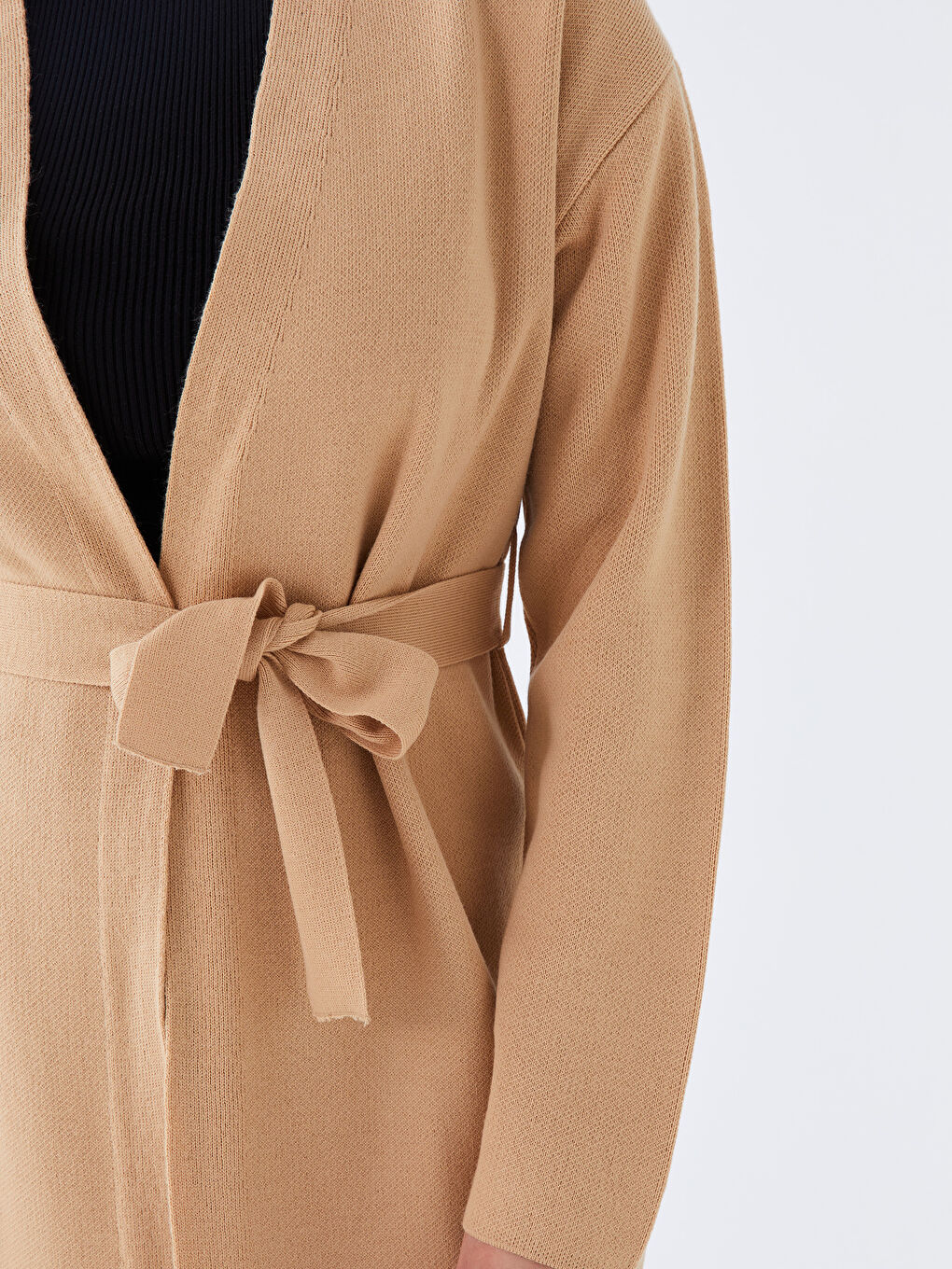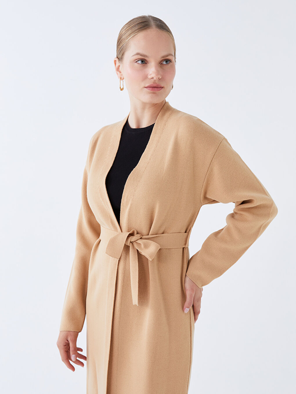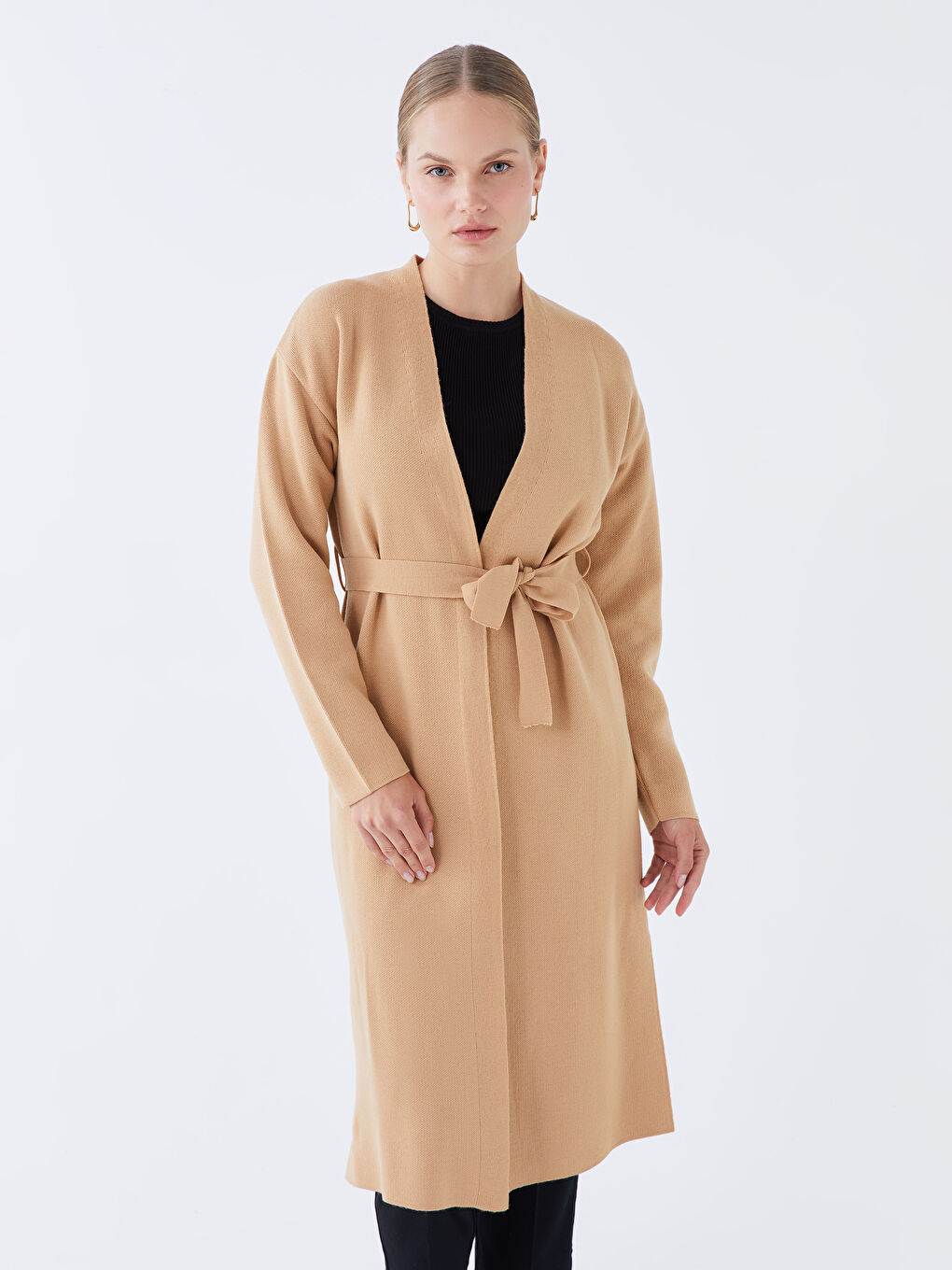 این ژاکت بافتنی یقه شالی با جزئیات گره‌ای در کمر، ظاهری شیک ارائه می‌دهد و کاملاً اندازه است. طراحی آستین بلند آن، ضمن گرم نگه داشتن شما، استایل شما را تکمیل می‌کند.