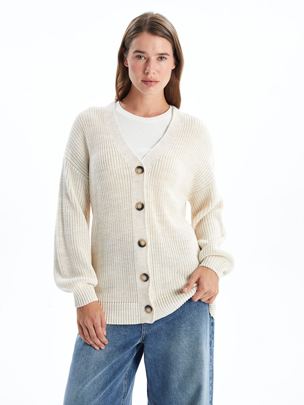 ژاکت بافتنی زنانه آستین بلند طرح‌دار Ecru V-Neck