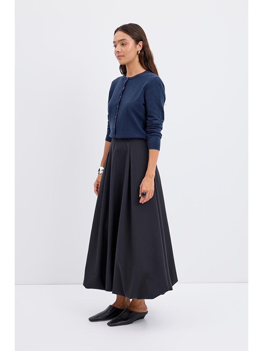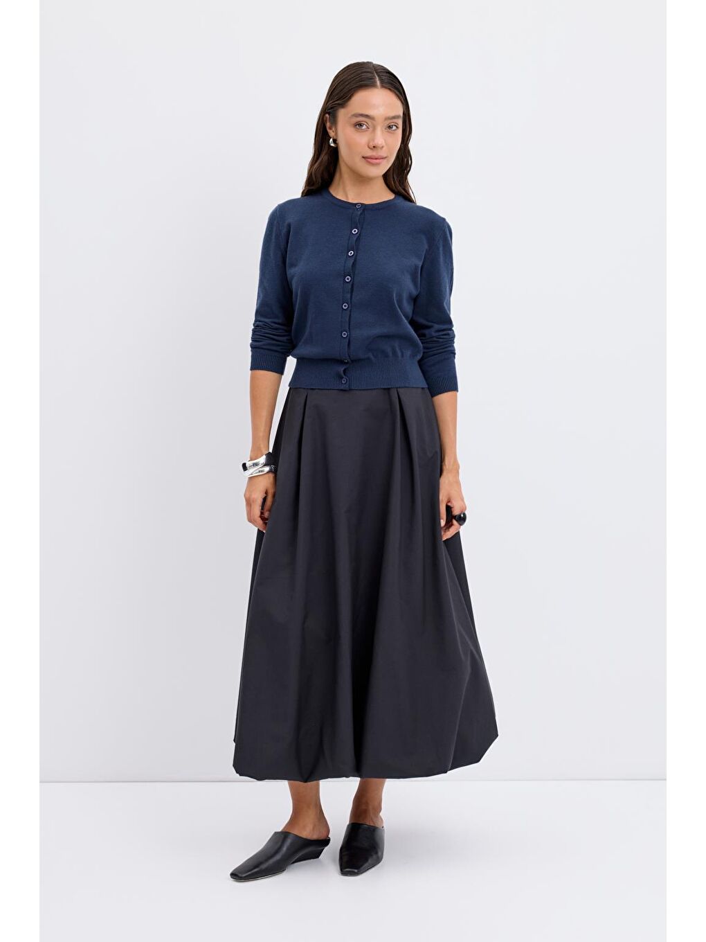 توضیحات محصول ژاکت بافتنی دکمهدار یقه گرد سرمهای با طراحی ساده و جزئیات ظریف خود، استایل روزانه شما را تکمیل میکند. پارچه بافتنی نرم، راحتی را در تمام طول لباس فراهم میکند، در حالی که یقه گرد، ظاهری کلاسیک و جاودانه ایجاد میکند. به لطف جزئیات دکمهدار در جلو، میتوان آن را به صورت باز یا بسته پوشید. این یک قطعه ضروری در کمد لباس شماست که میتوانید به راحتی آن را به تنهایی یا در ترکیبهای چند لایه در طول تغییرات فصلی انتخاب کنید. ویژگیهای محصول نوع محصول: ژاکت بافتنی یقه: یقه گرد نحوه بسته شدن: دکمهدار آستین و لبه: کشباف راه راه محتویات و مراقبت ۵۲٪ ویسکوز، ۲۸٪ PES، ۲۰٪ پلیاکریل. قابل شستشو با ماشین لباسشویی در دمای پایین. قابل اتوکشی از پشت و رو در دمای پایین. ممکن است هنگام پهن کردن، ۲-۳ سانتیمتر اختلاف در اندازهها وجود داشته باشد. اندازههای مدل: قد ۱۷۷ سانتیمتر، سینه ۶۹ سانتیمتر، باسن ۳۶ اینچ.