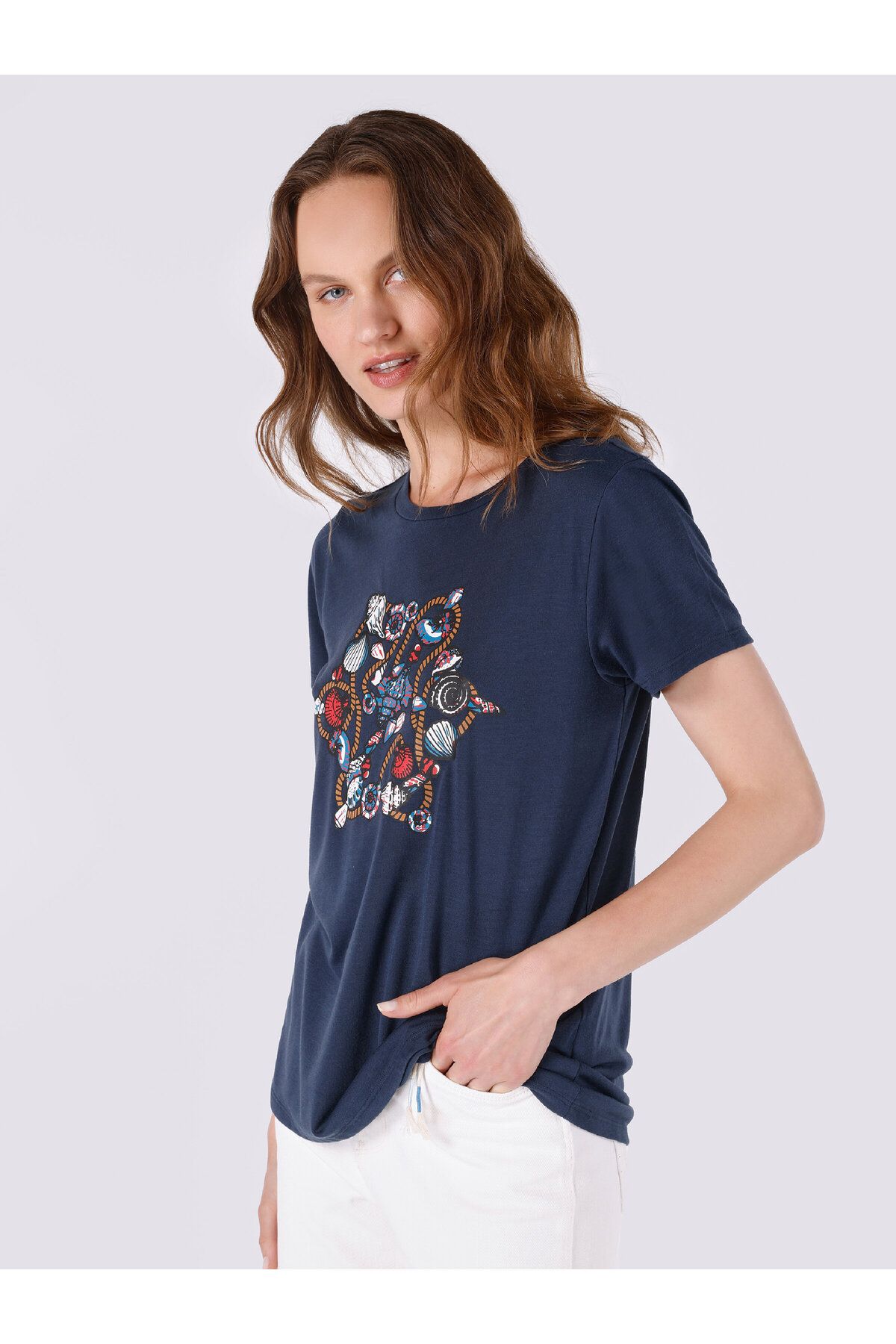 تی شرت آستین کوتاه زنانه با یقه سرمه ای با چاپ معمولی