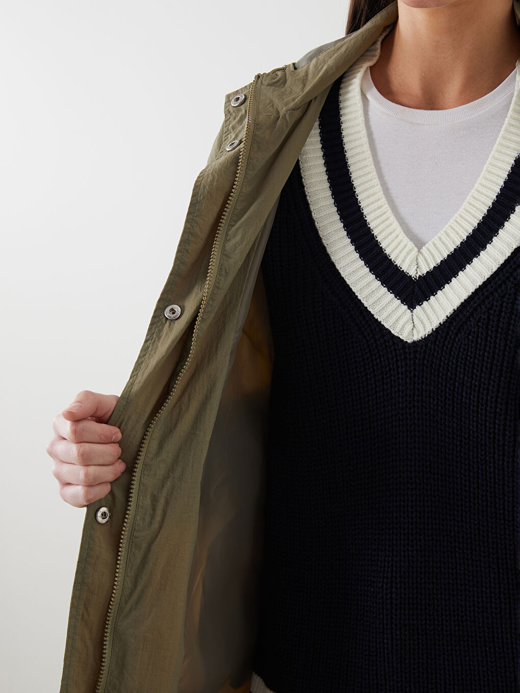بارانی زنانه با کلاه و یقه ایستاده و بنددار، ساخته شده از پارچه چیندار. در جلو با دکمه فشاری بسته میشود و سر آستینها کشسان است.