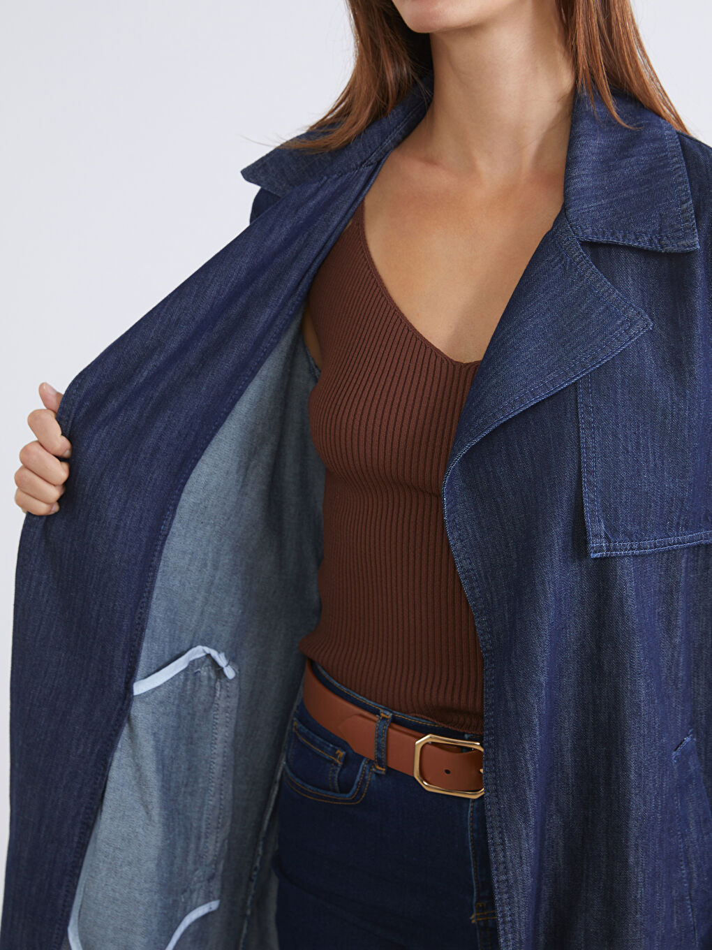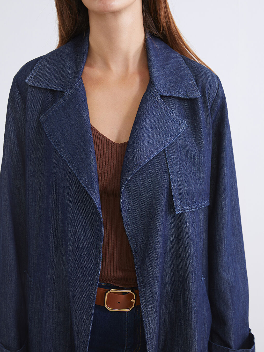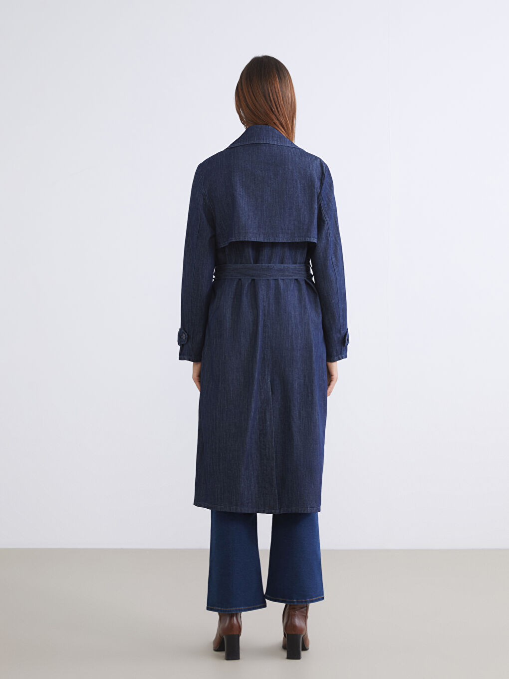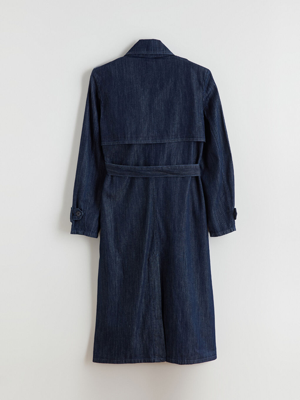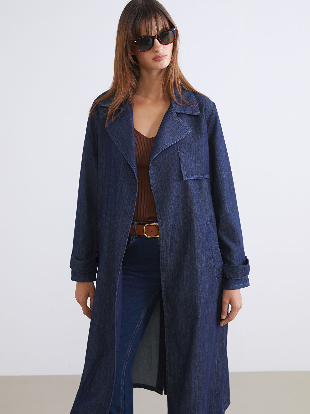 این کت بارانی زنانه با یقه کتی از پارچه جین دوخته شده است. آستینهای آن بلند است، جلوی آن دکمهدار است و در کمر آن کمربند وجود دارد.