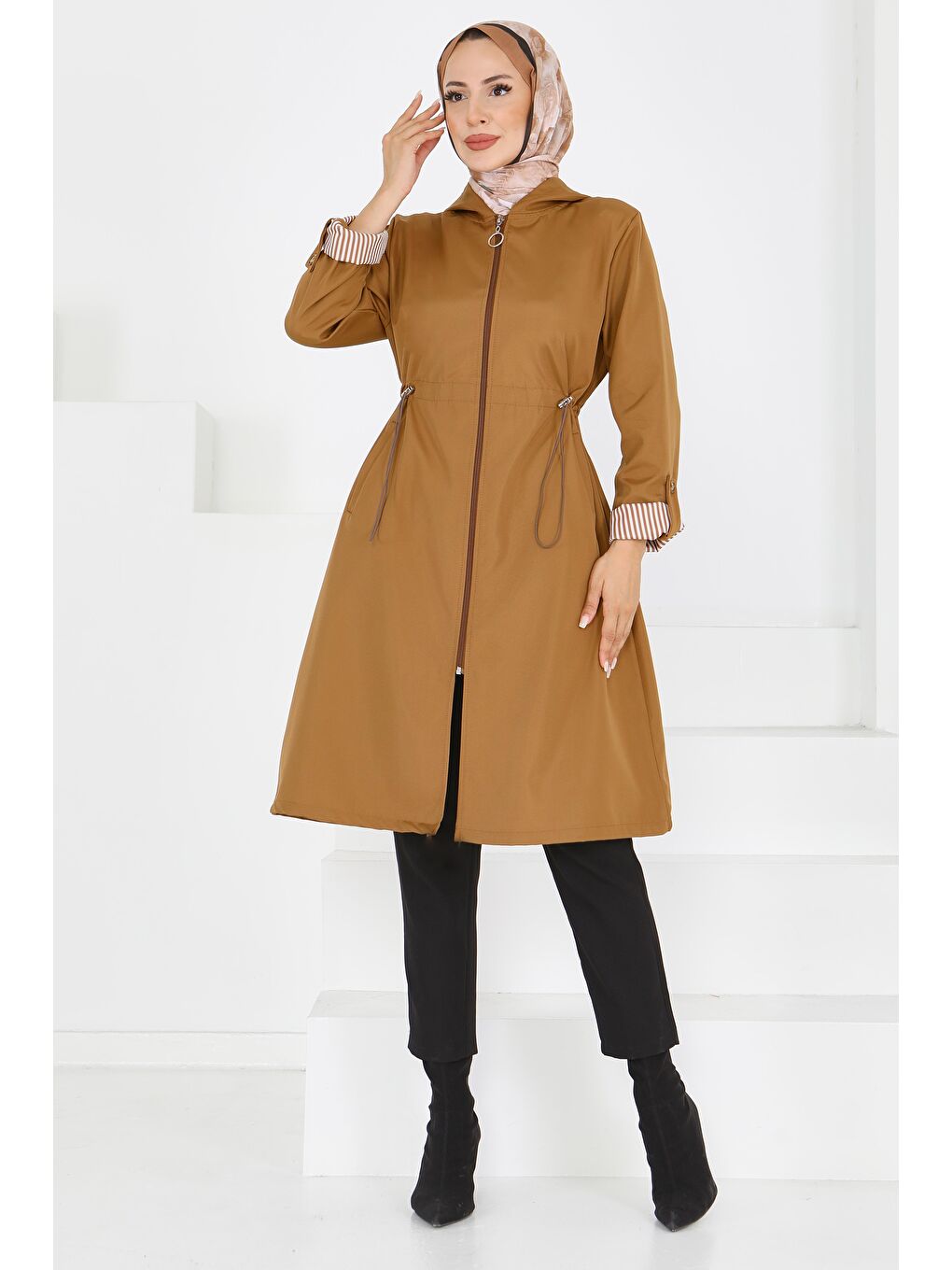 کت ترنچ میراندا با زیپ و کمر کشی قهوهای، رنگ قهوهای روشن – کد 27624