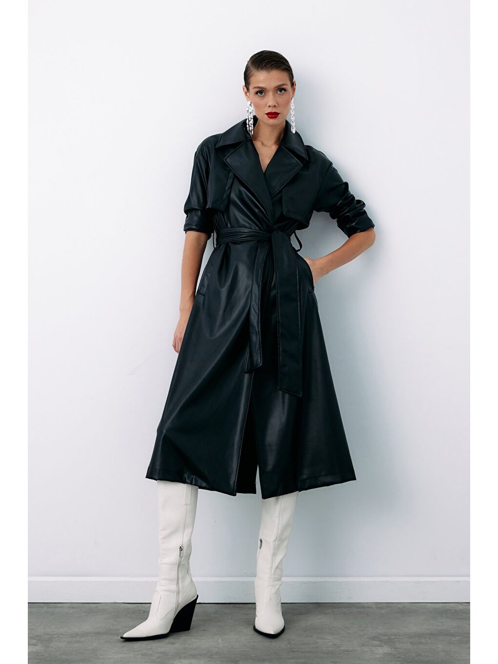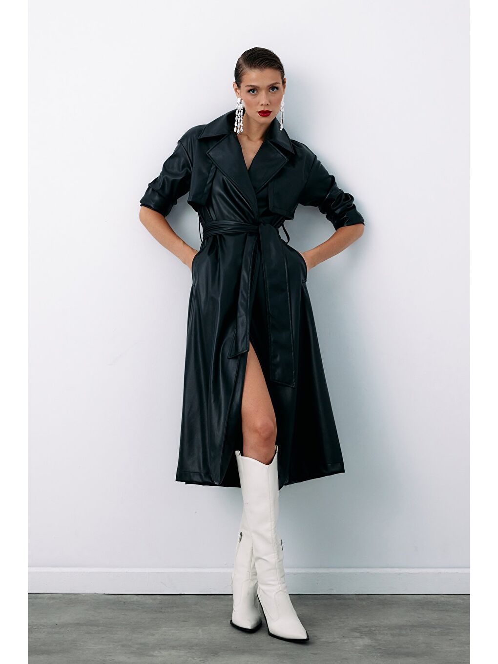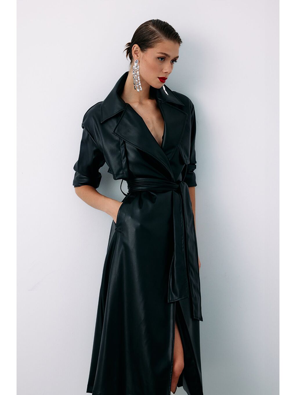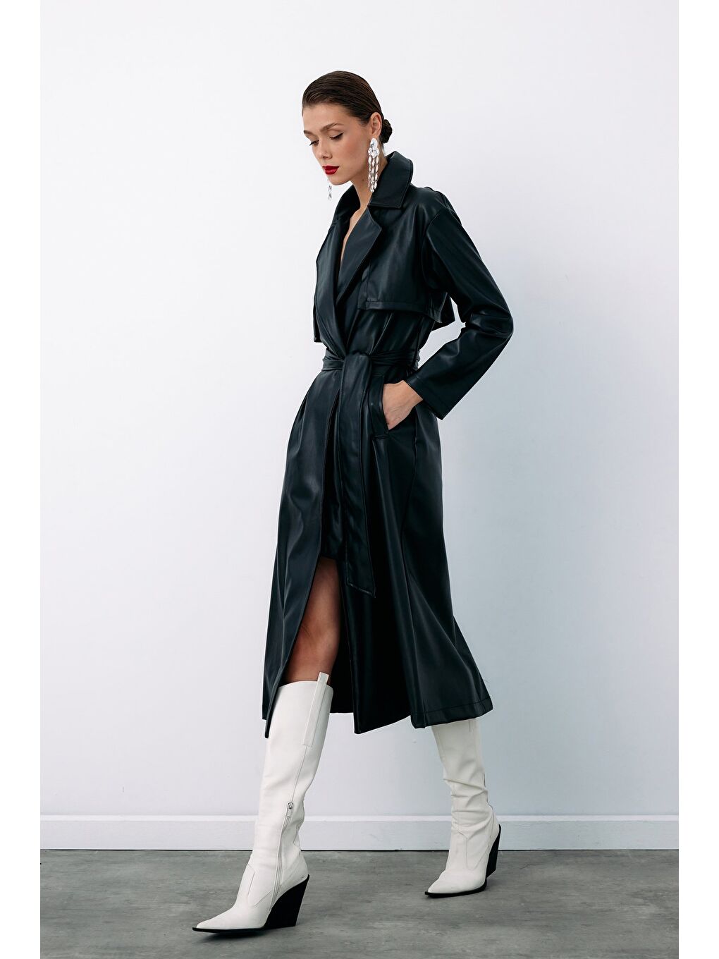کت چرم بلند طرح ترنچ کمربنددار – مشکی