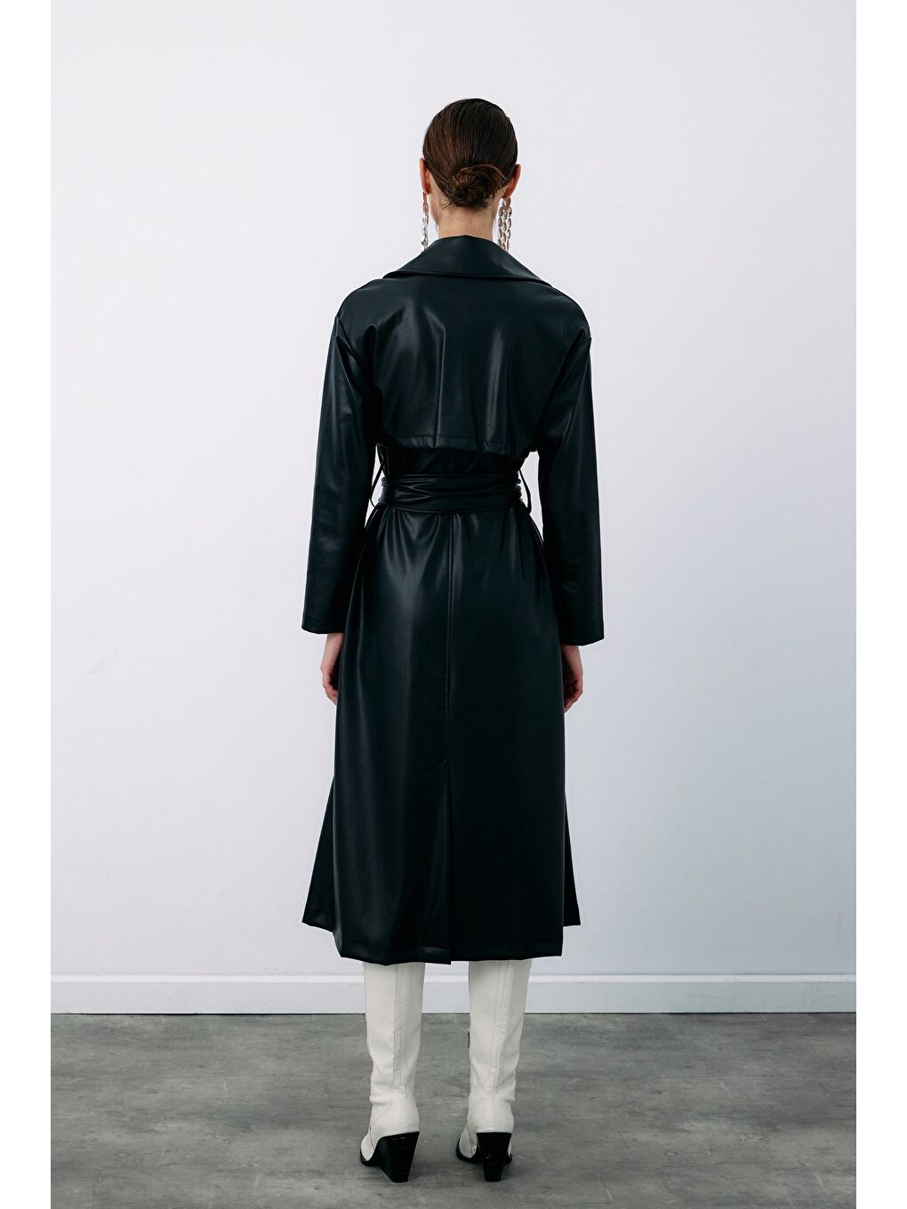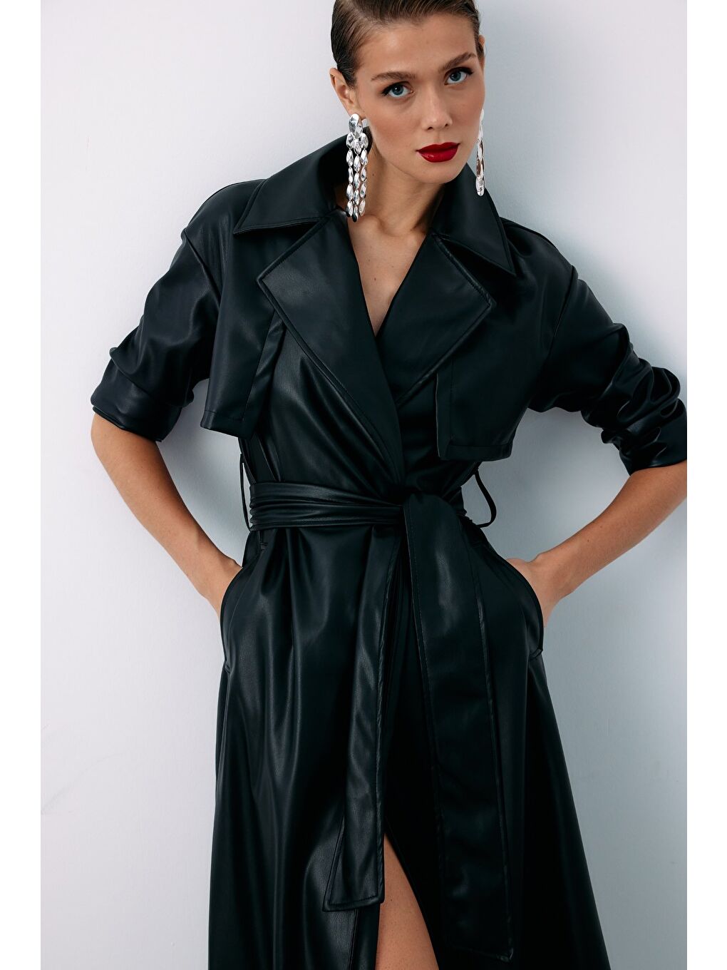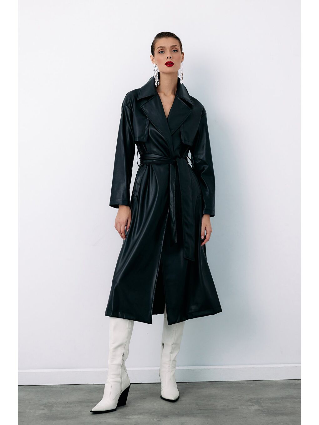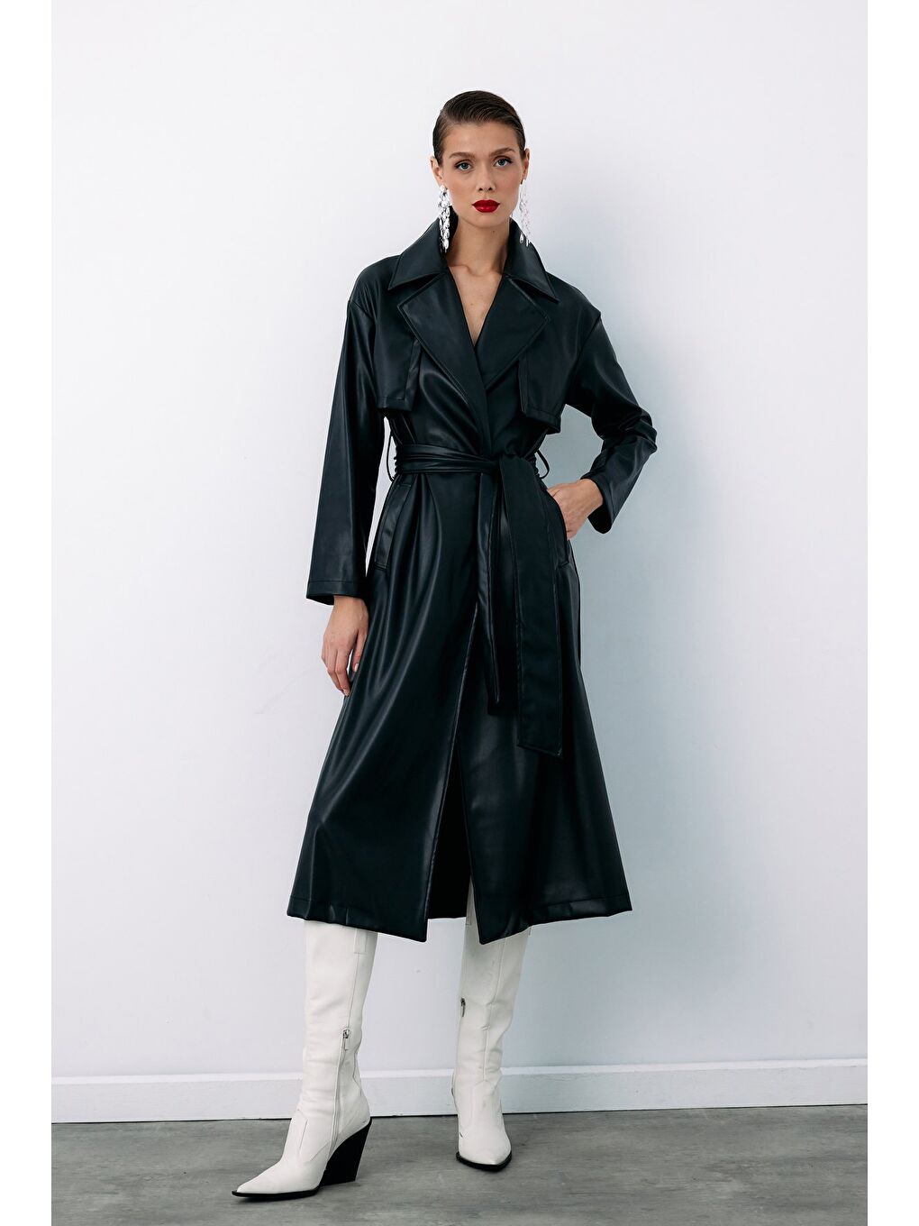 کت چرم بلند طرح ترنچ کمربنددار – مشکی