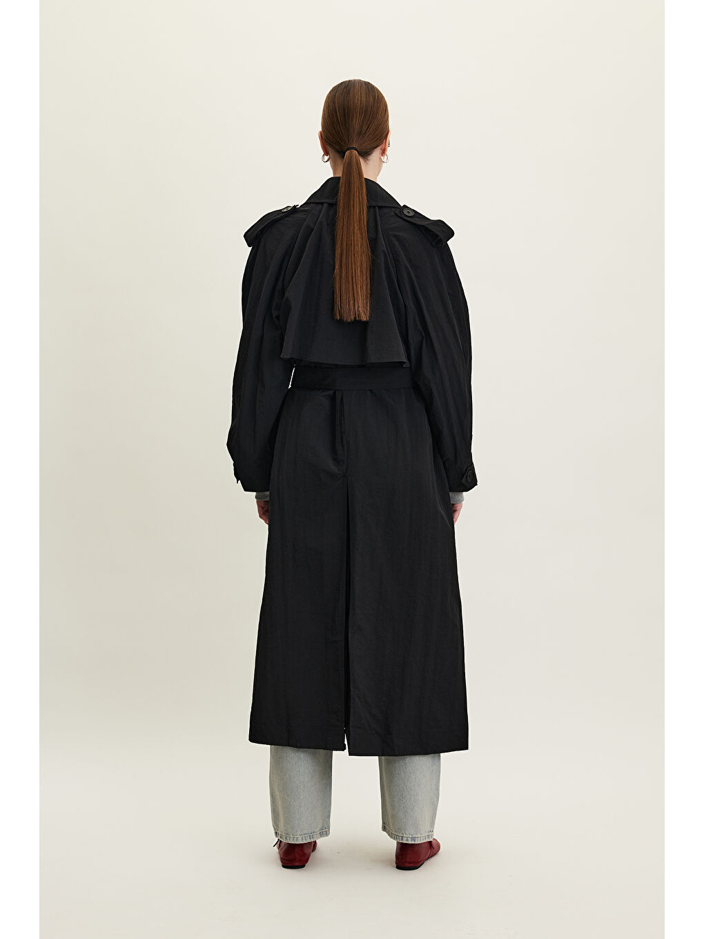 بسته شدن دو دکمه، جزئیات بادگیر در جلو و عقب، آستین‌های رگلان، سرآستین‌های انتهای آستین، جزئیات دکمه، فیت بزرگ، بدون آستر، بلند، دارای کمربند و پارچه چتر نجات. ۱۰۰٪ پلی‌استر، فقط خشکشویی، اتوکشی از پشت با حرارت کم. سایز SM: طول: ۱۲۷ سانتی‌متر، دور باسن: ۶۸ سانتی‌متر، سینه: ۶۱ سانتی‌متر، طول آستین: ۷۴.۵ سانتی‌متر سایز ML: طول: ۱۲۸ سانتی‌متر، دور باسن: ۶۸ سانتی‌متر، سینه: ۶۳ سانتی‌متر، طول آستین: ۷۵ سانتی‌متر