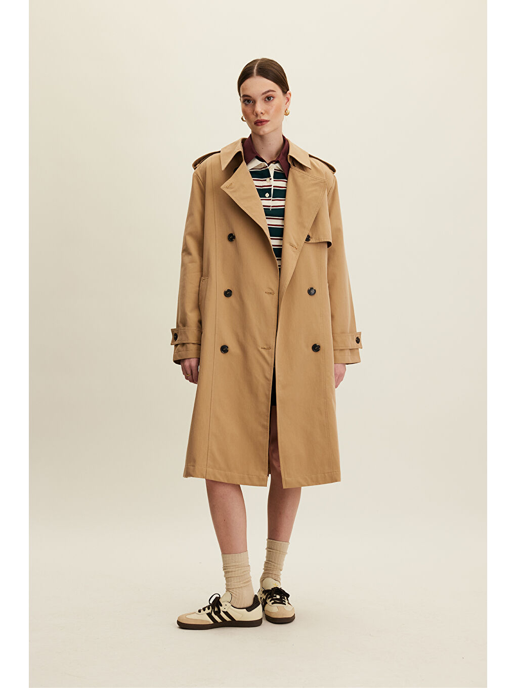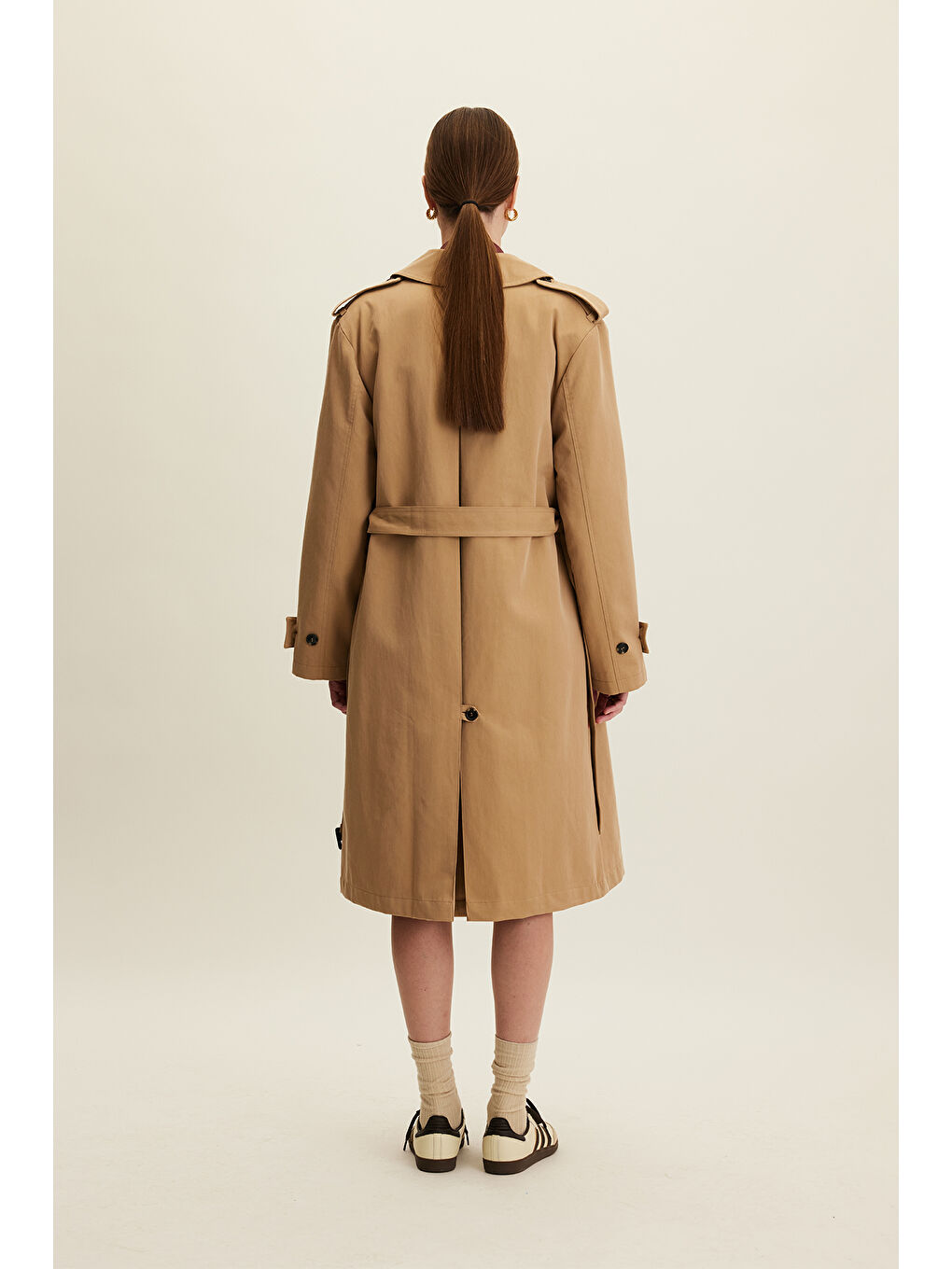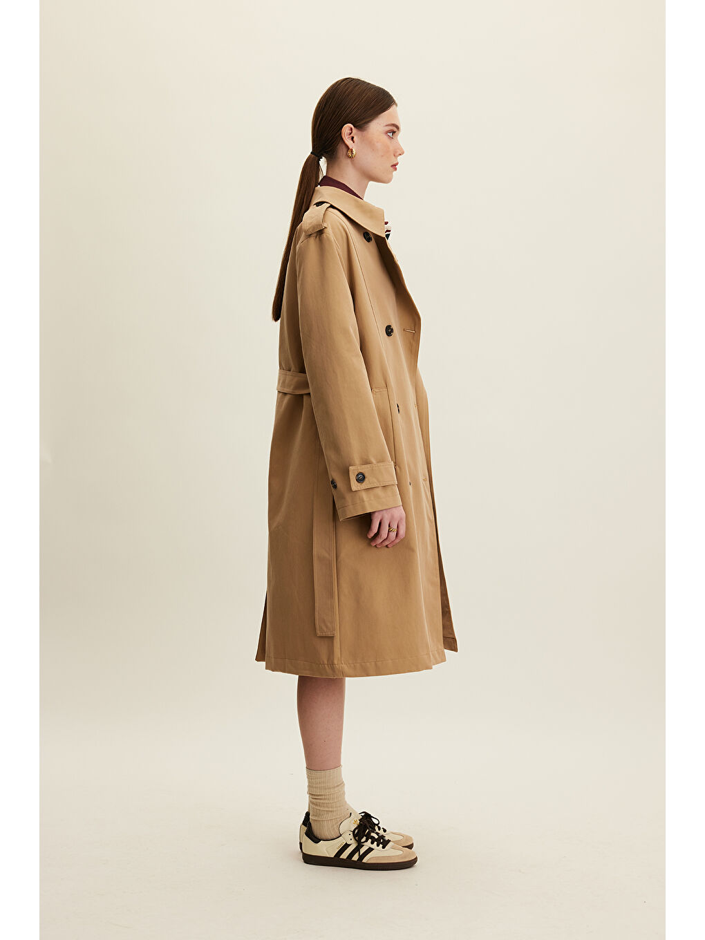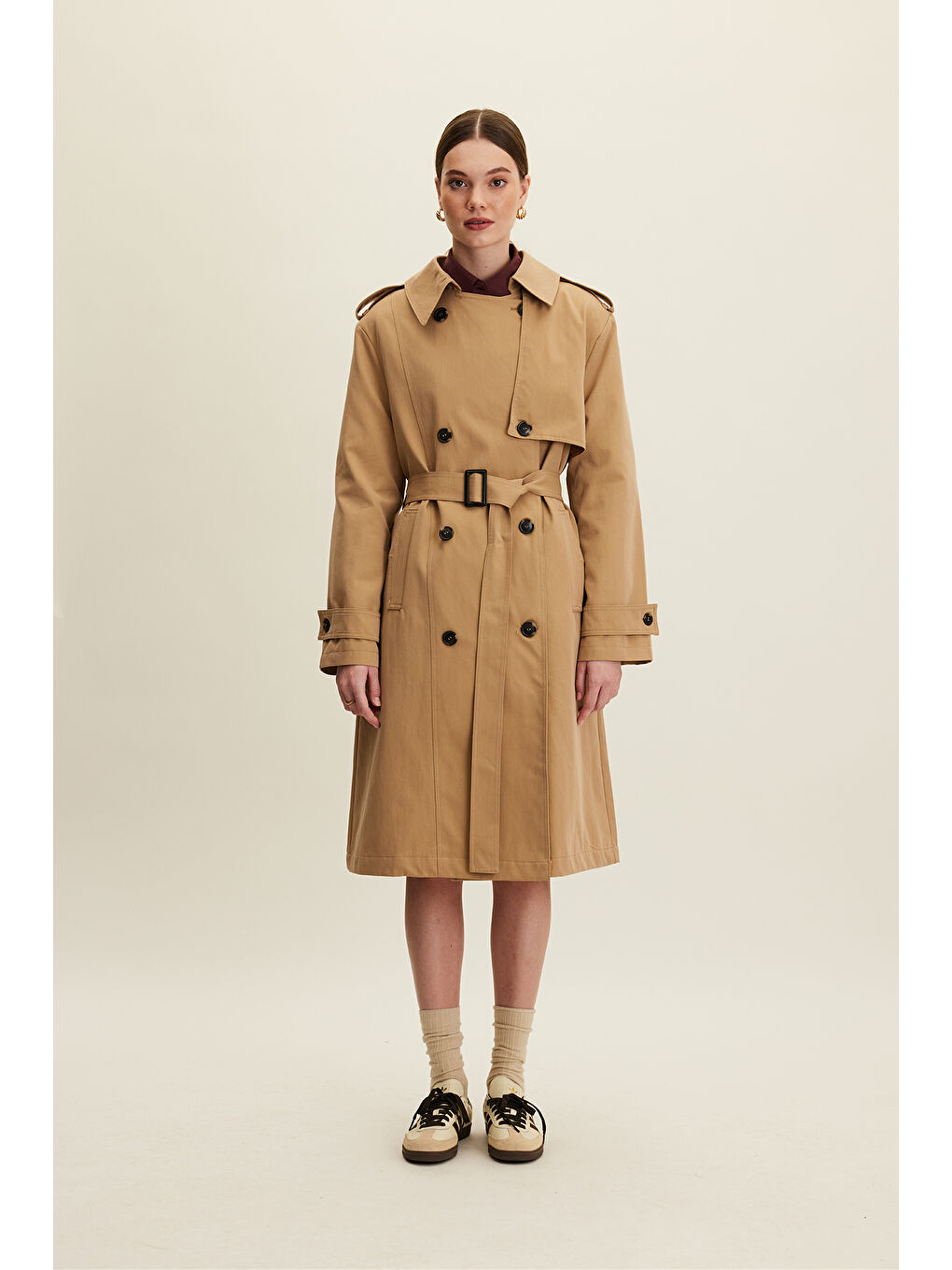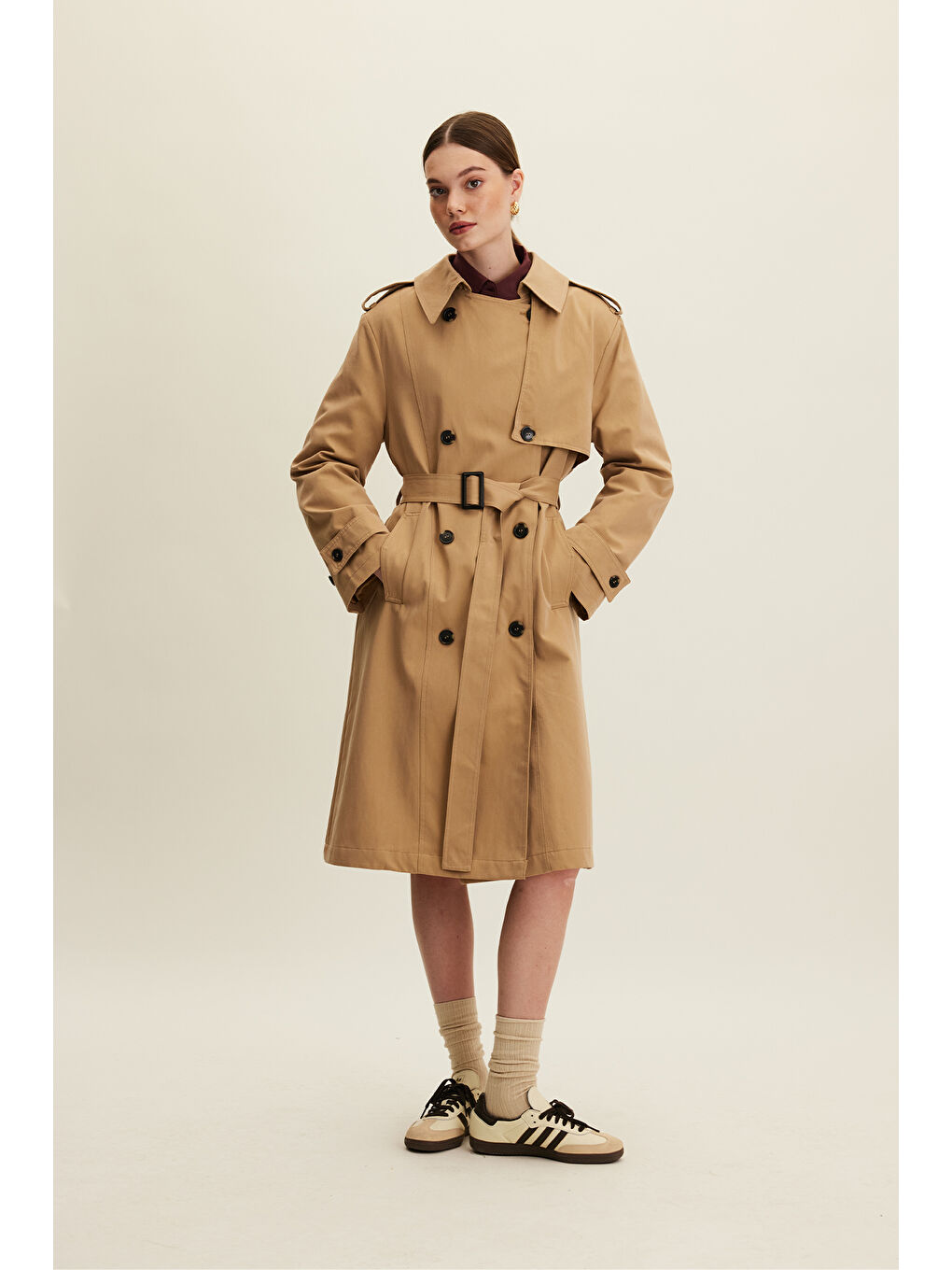 کت ترنچ کمربنددار دو دکمه قهوهای آنیکا مدل شتری