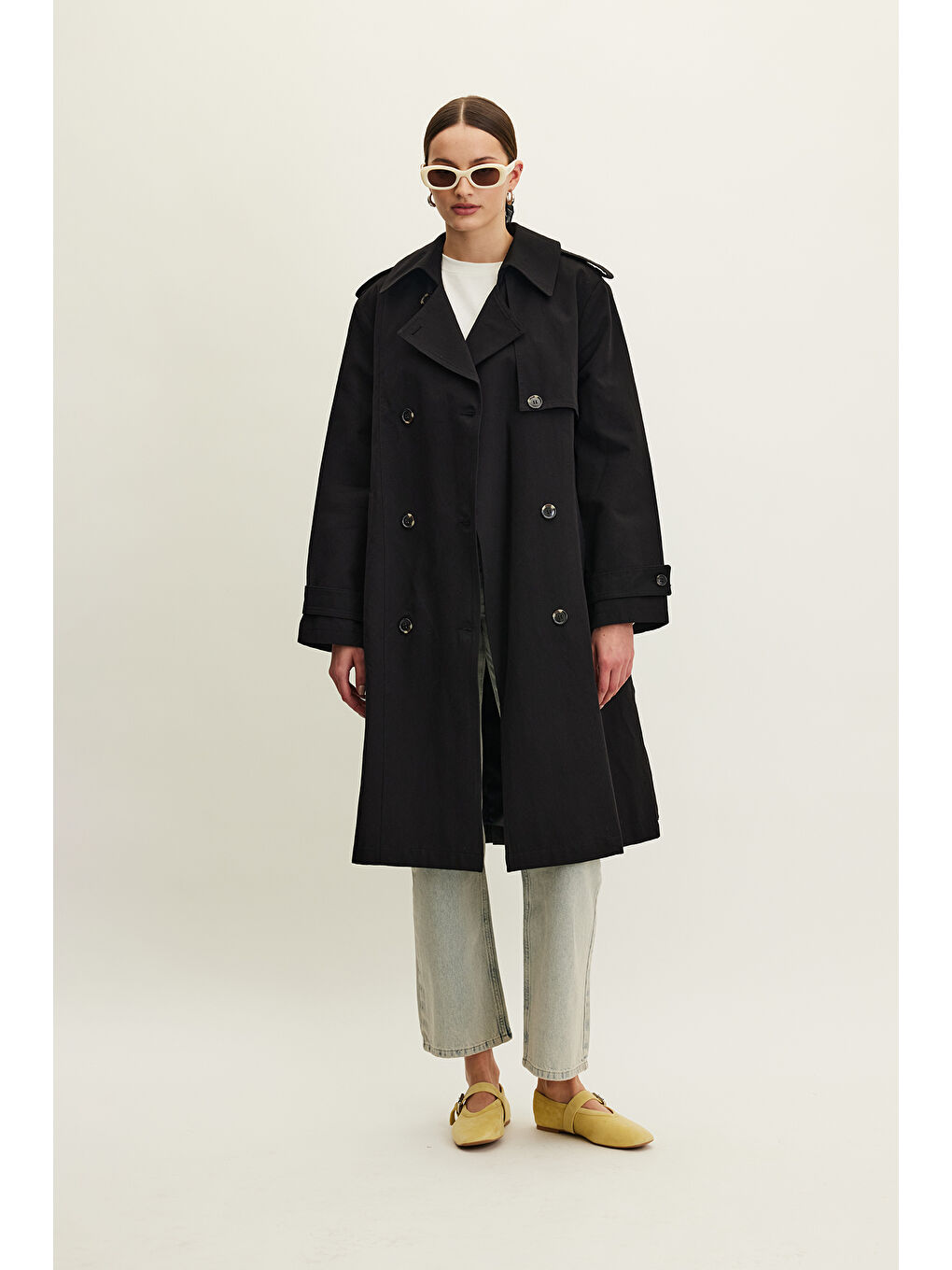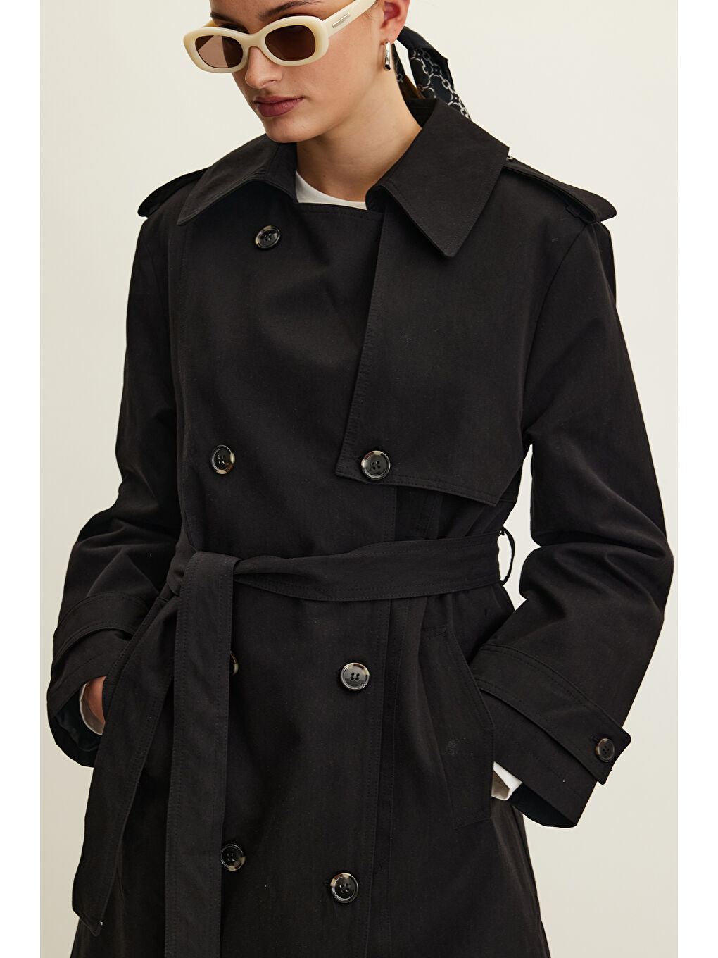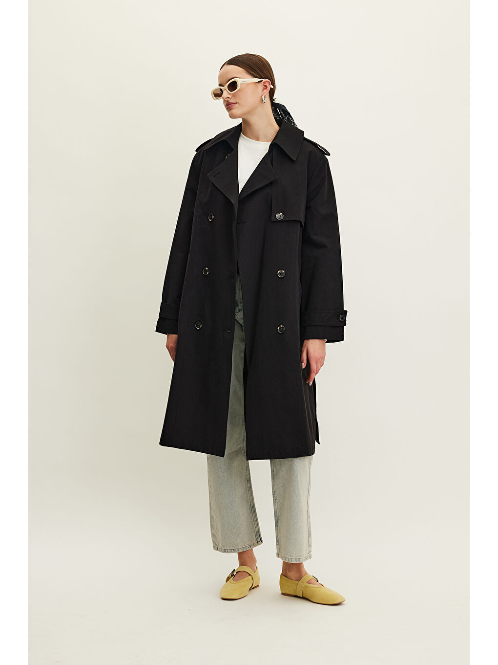 کت بارانی کمربنددار دو دکمه آنیکا مشکی