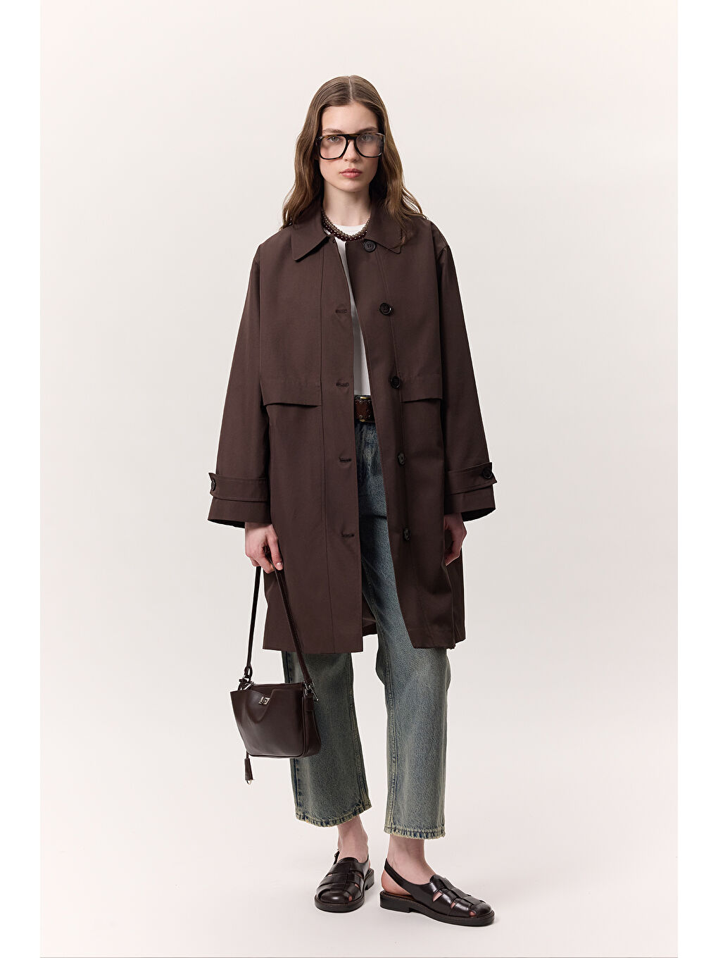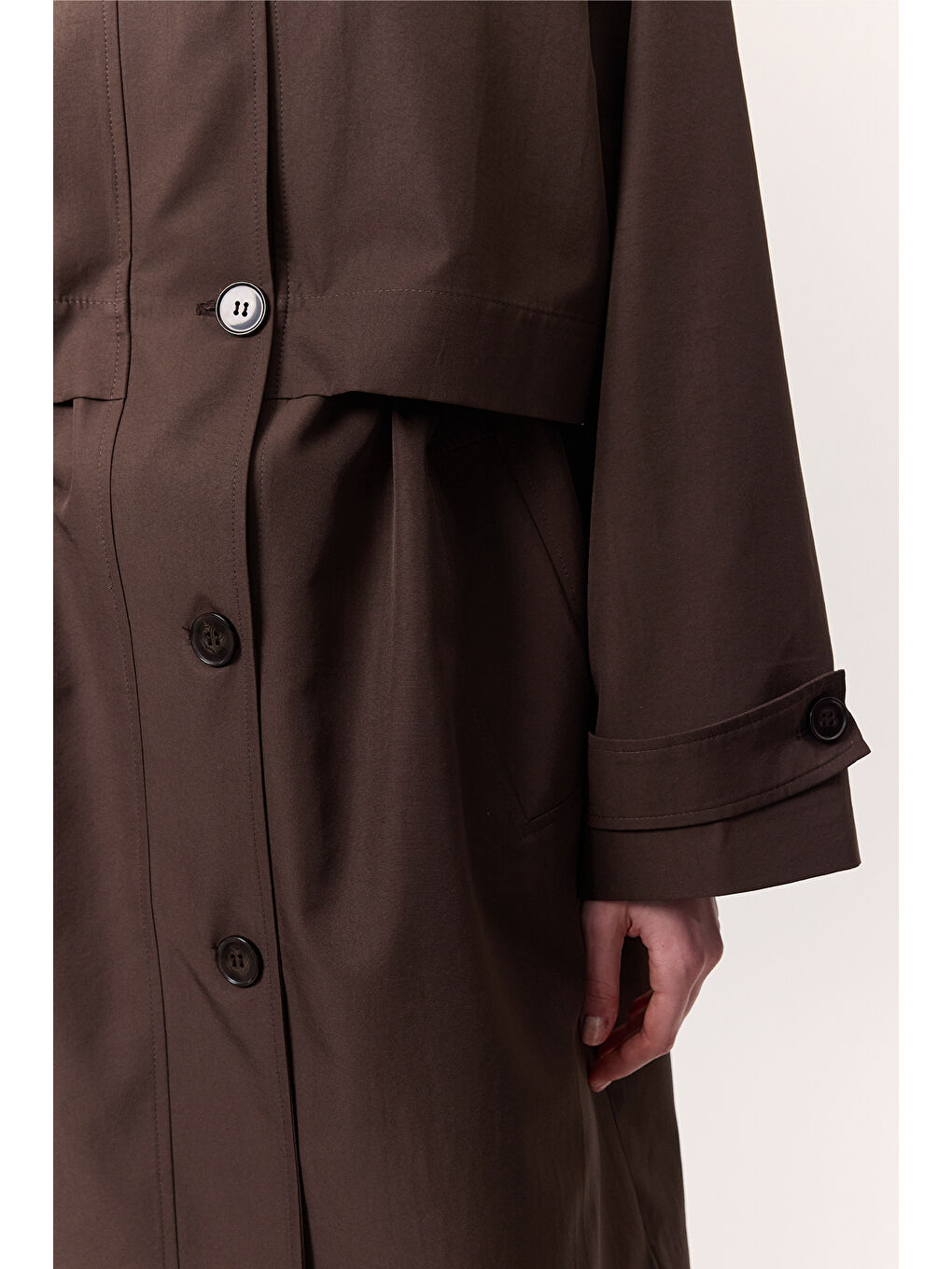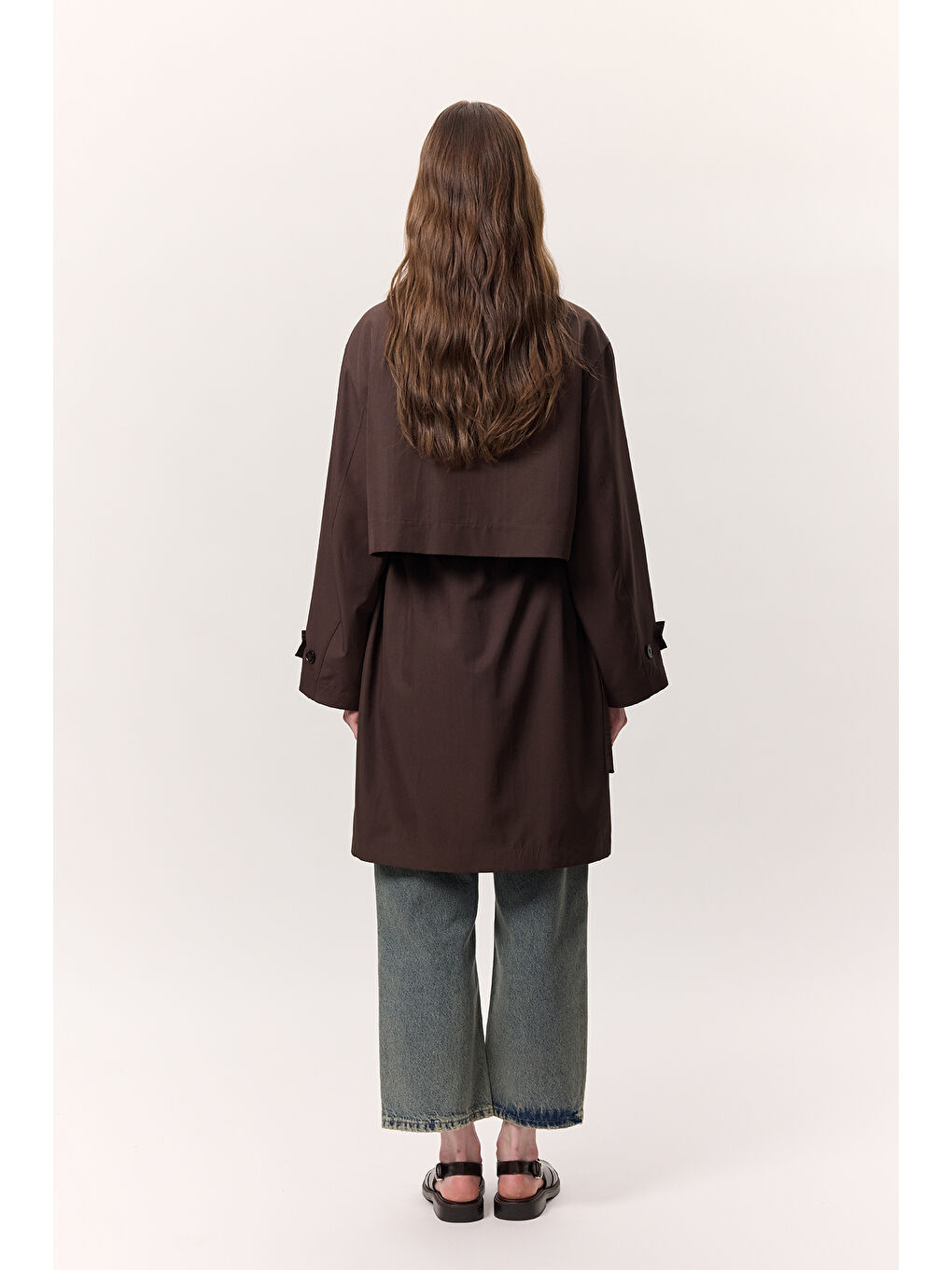 کت ترنچ سبک با کمر قهوه‌ای قابل تنظیم، شکلاتی