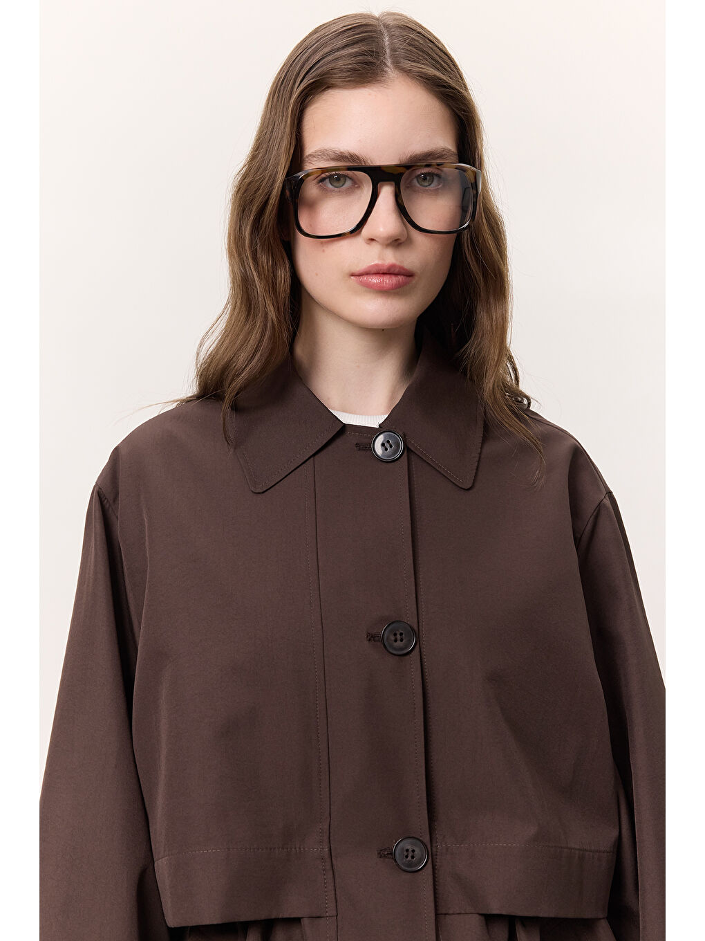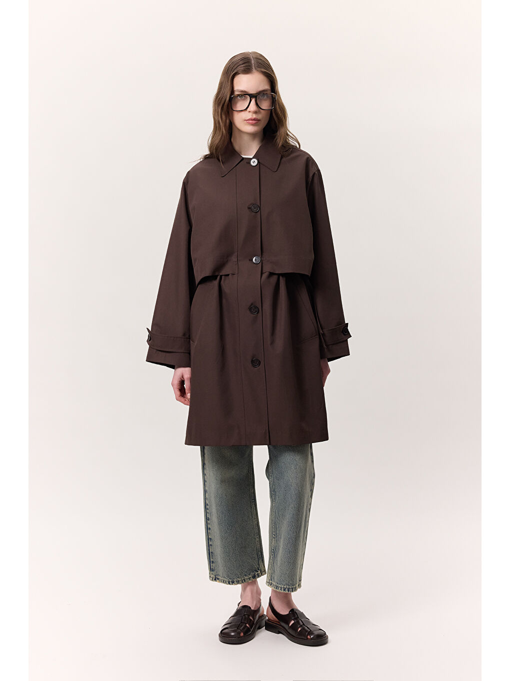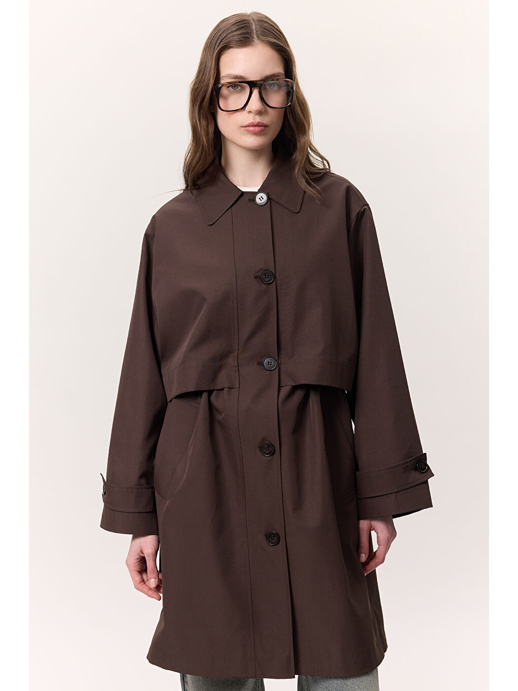 کت ترنچ سبک با کمر قهوه‌ای قابل تنظیم، شکلاتی