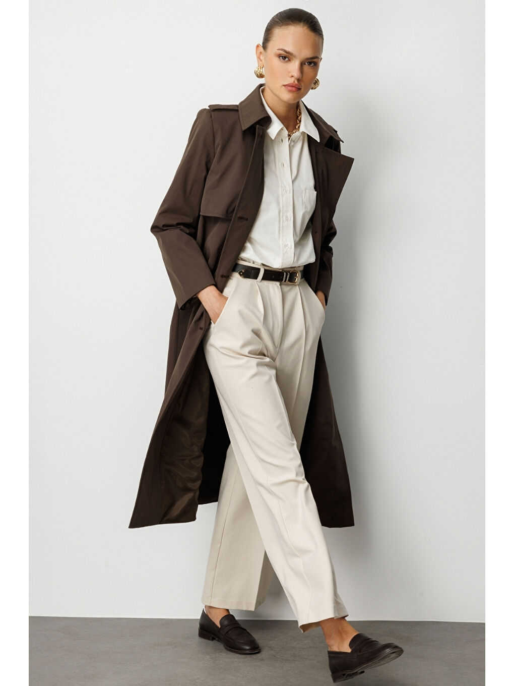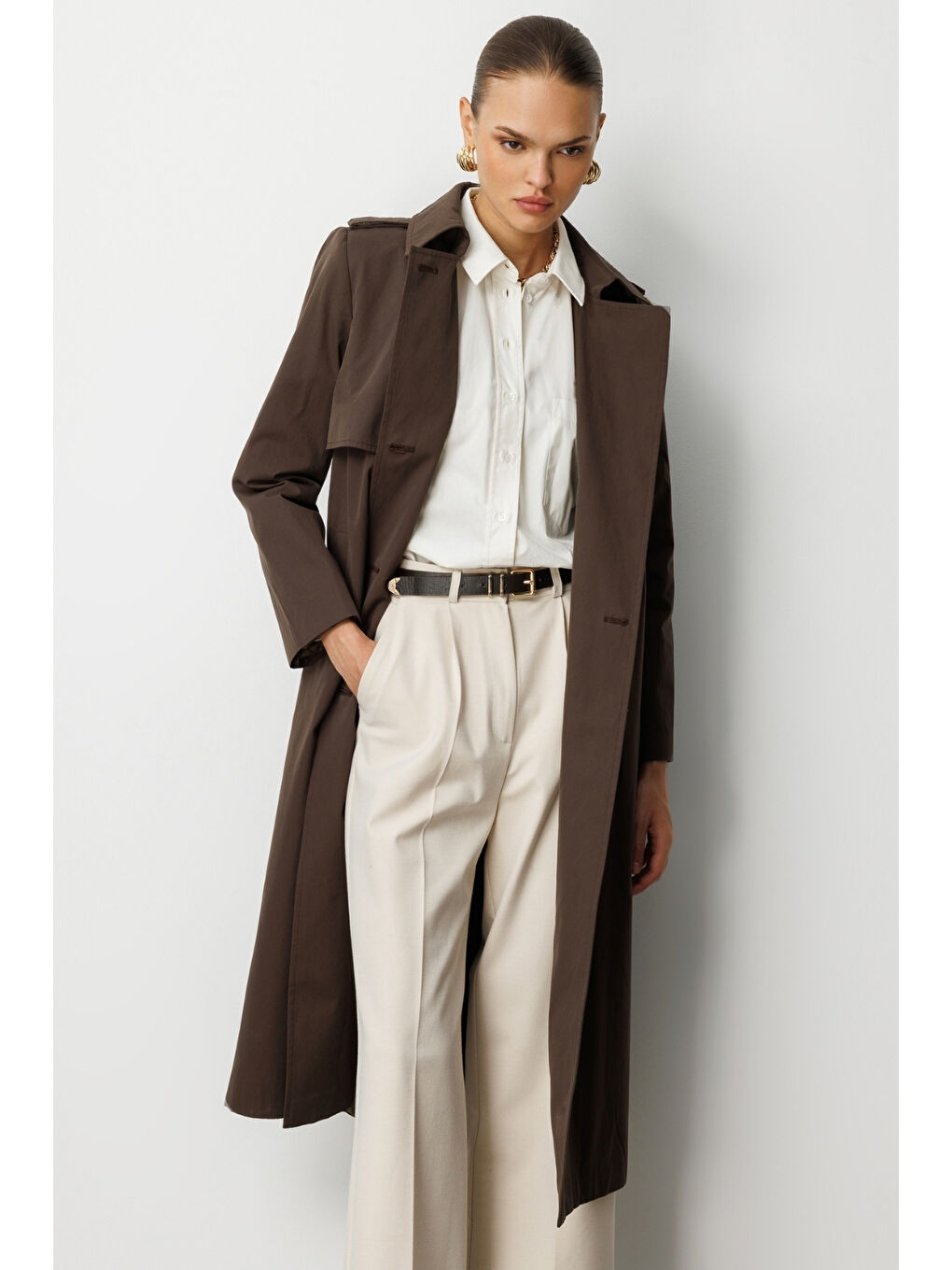 کت ترنچ قهوهای دکلته کلاسیک ماکسی مک